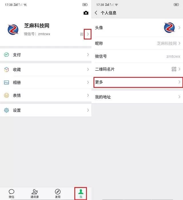 接下来,进入微信 的 「我」,然后点击名称右侧的 “箭头”图标,之后点击进入 「更多」设置,如图所示。