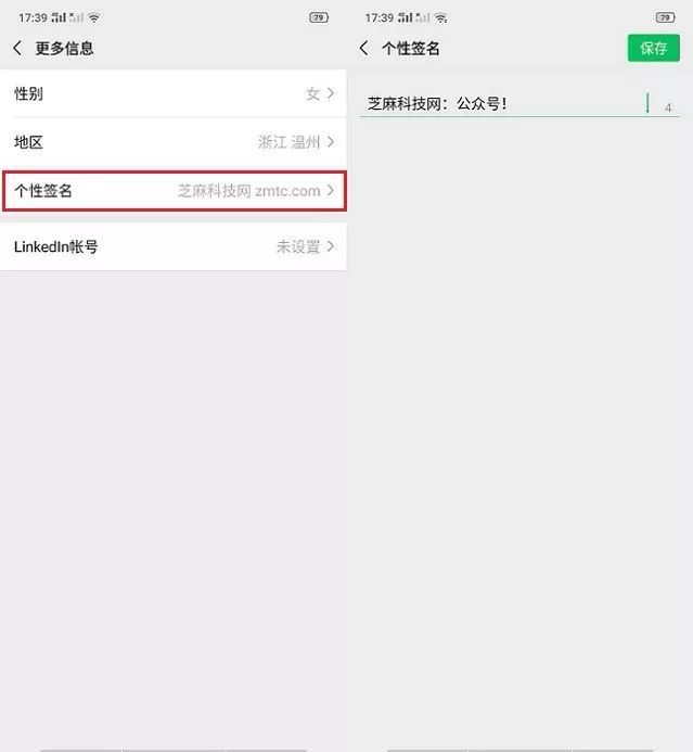 最后编辑个性签名,然后将刚才复制的特殊代码内容粘贴进来,然后文字部分修改成你需要的内容即可,完成后点击“保存”即可(空格部分不要动),如图所示。