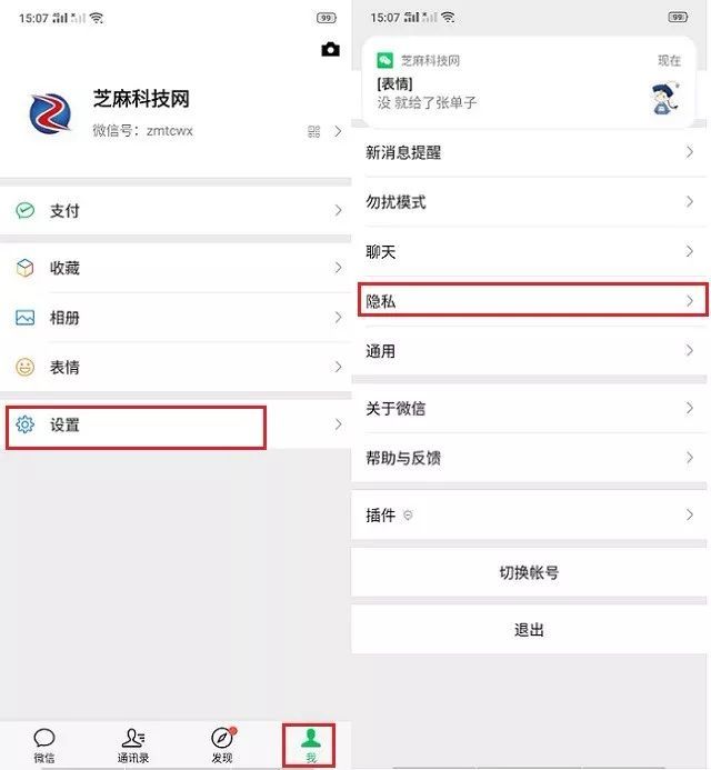 首先在手机中打开微信APP,然后依次点「我」->「设置」->「隐私」,如图所示。